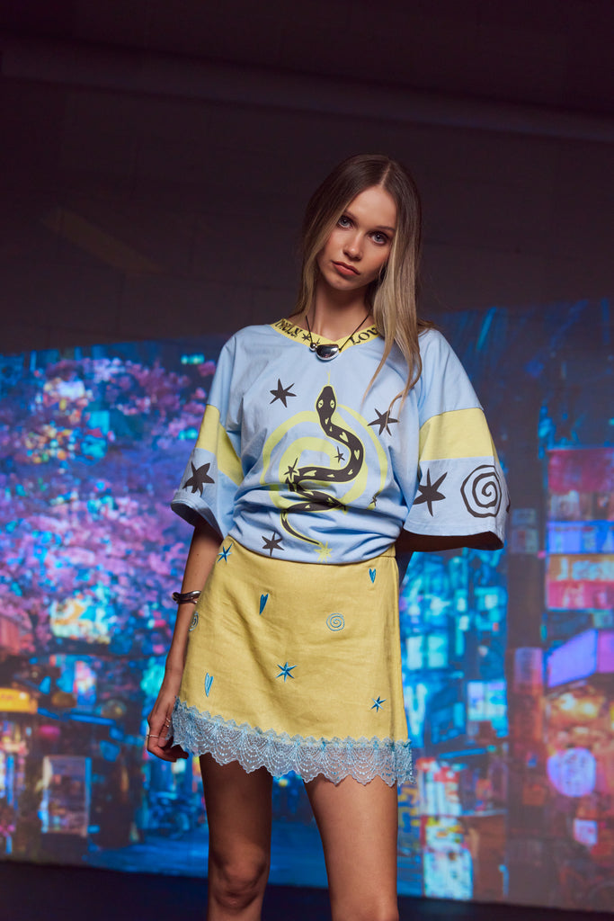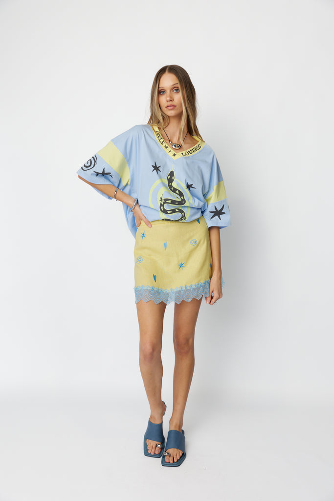 Adorned with our signature lucky and omen symbols, the Lucky Mini Skirt brings a playful touch of Good Omens energy to your everyday wardrobe. With its flattering A-line shape, flat front waistband and softly elasticated back, it sits comfortably at the waist while keeping an easy, effortless silhouette.