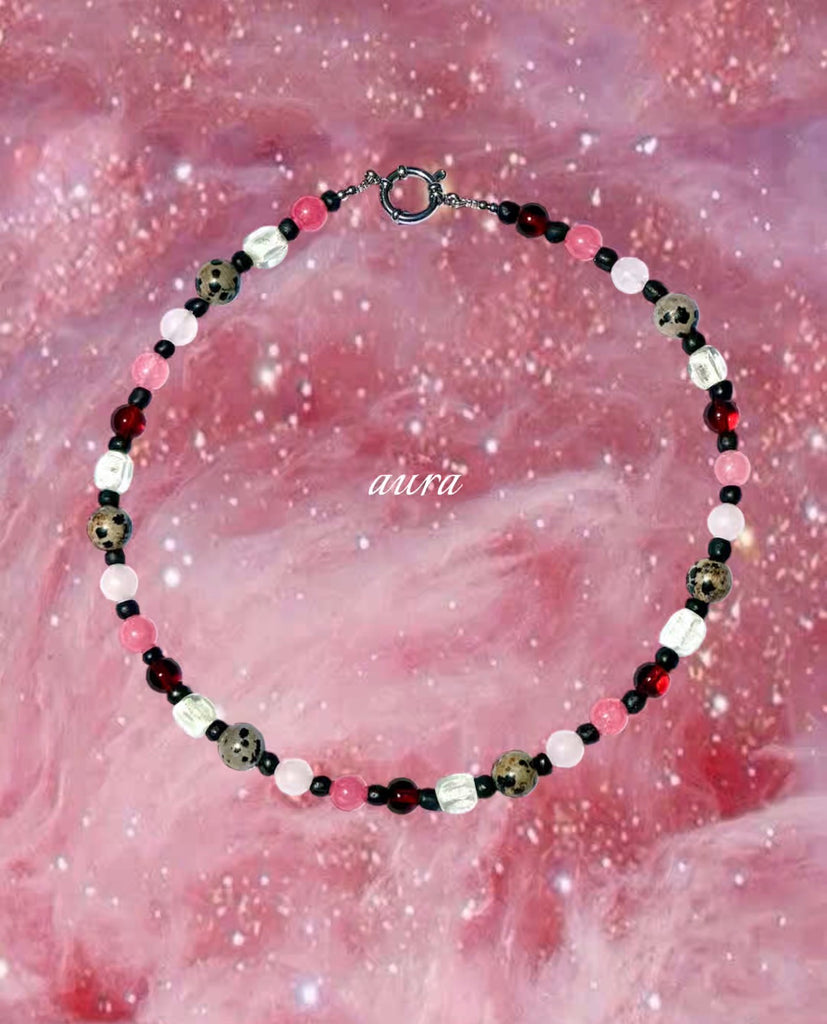The Aura Necklace features a mix of dalmatian jasper, agate, and glass beads, each one slightly different, giving the piece its own quiet character. Designed to sit close to the neckline, it adds an easy touch of colour and symbolism to everyday outfits.