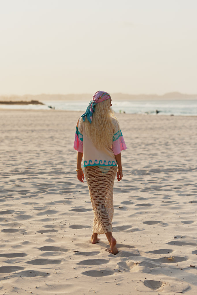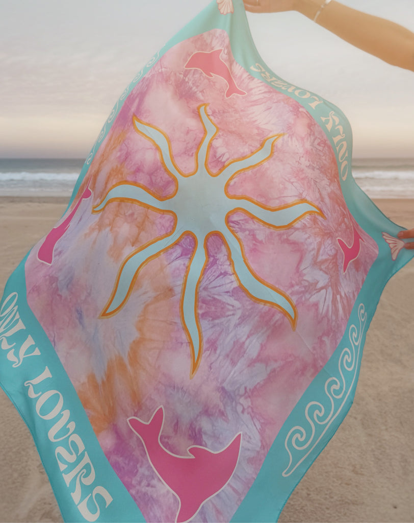 The Seashell Motel Silk Scarf is crafted from luxurious 100% silk satin (14 momme), smooth, luminous, and made to glow in the light. Featuring original hand-dyed artwork created by Only Lovers Left and woven with dolphins, seashells, waves, and sun motifs from the Seashell Motel world, each piece captures the spirit of coastal daydreams. Generously sized at 80 × 80 cm, it’s endlessly versatile: wear it as a headscarf, a bandana top, a belt, or tied to your bag for a touch of seaside nostalgia.