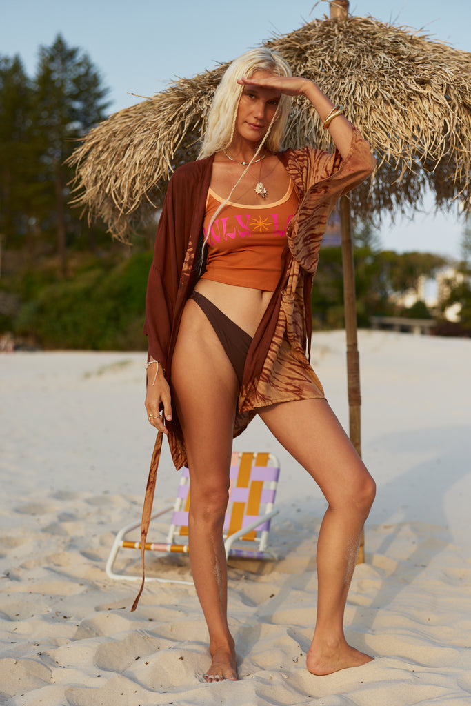Crafted from a soft ribbed cotton–spandex blend, it’s stretchy yet structured, hugging in all the right places. Designed with a flattering low neckline, open back, and contrast trim, it’s finished with a punchy front print and a cute little sun motif that brings the Seashell Motel energy full circle.