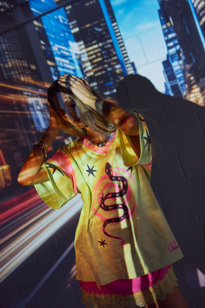 The Serpent Tee brings a playful twist to a vintage jersey silhouette. Designed with an oversized relaxed fit, contrast arm panels and a sporty V-neck collar, it blends nostalgic athletic energy with the symbolic spirit of the Good Omens collection. The serpent graphic appears like a quiet talisman across the chest, bringing a little Good Omens energy to an easy everyday tee.